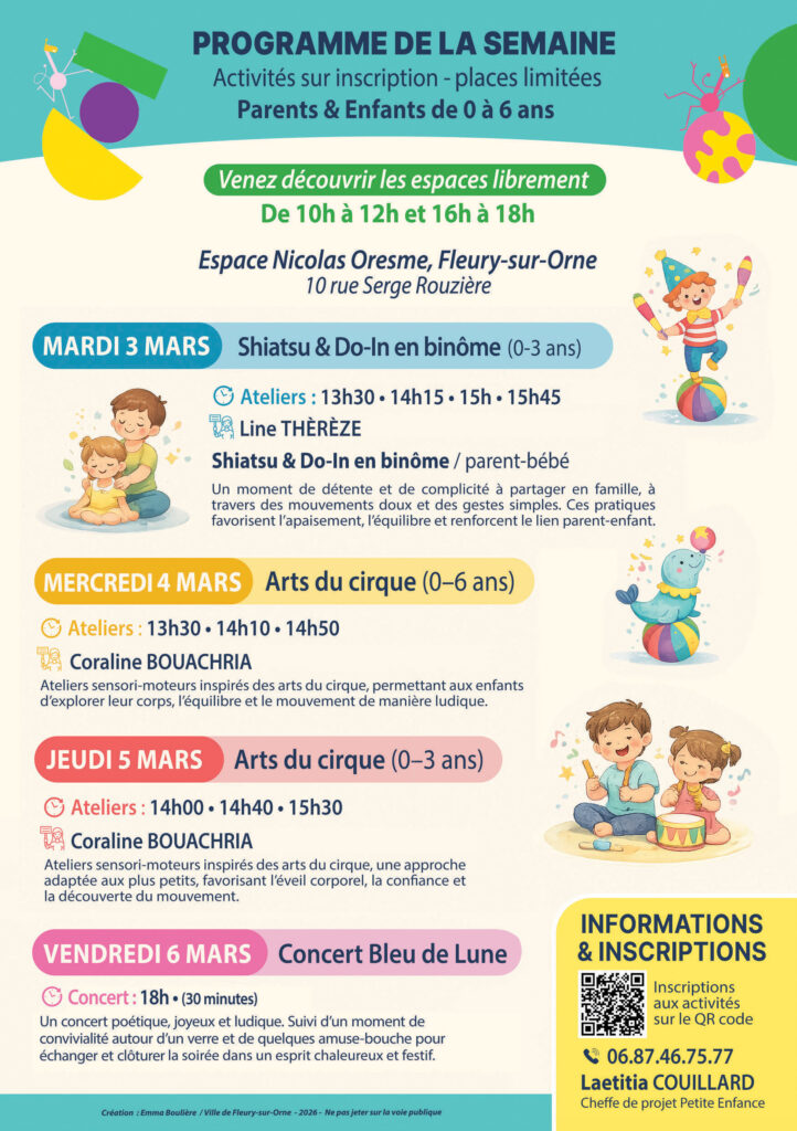 Rendez-vous à l’Espace Nicolas Oresme, 10 rue Serge Rouzière à Fleury-sur-Orne. Chaque jour, de 10h à 12h et de 16h à 18h, des espaces seront accessibles librement pour permettre aux familles d’explorer, tester, créer et bouger ensemble. Jeux créatifs, parcours d’équilibre et de motricité, ateliers sensoriels et espaces d’éveil culturel rythmeront ces temps forts dédiés à l’éveil et au développement des enfants.